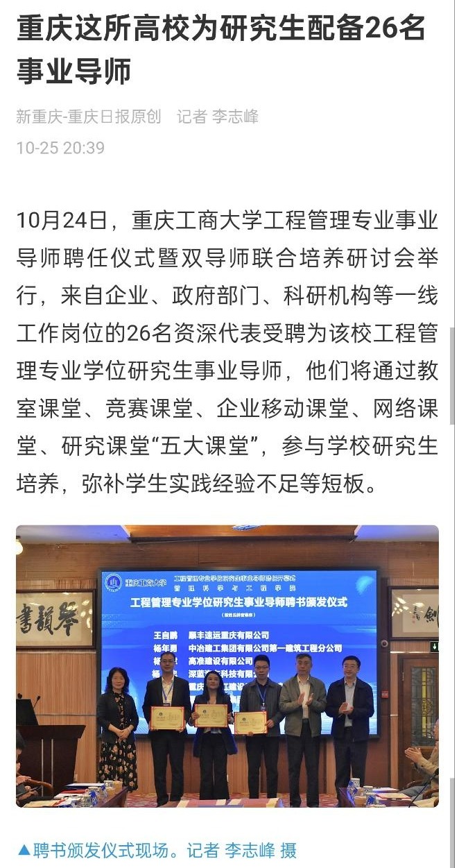 2、华龙网:《26位“事业导师”上任!HAHA体育工程管理专业学位研究生实行“双导师”培养新模式》