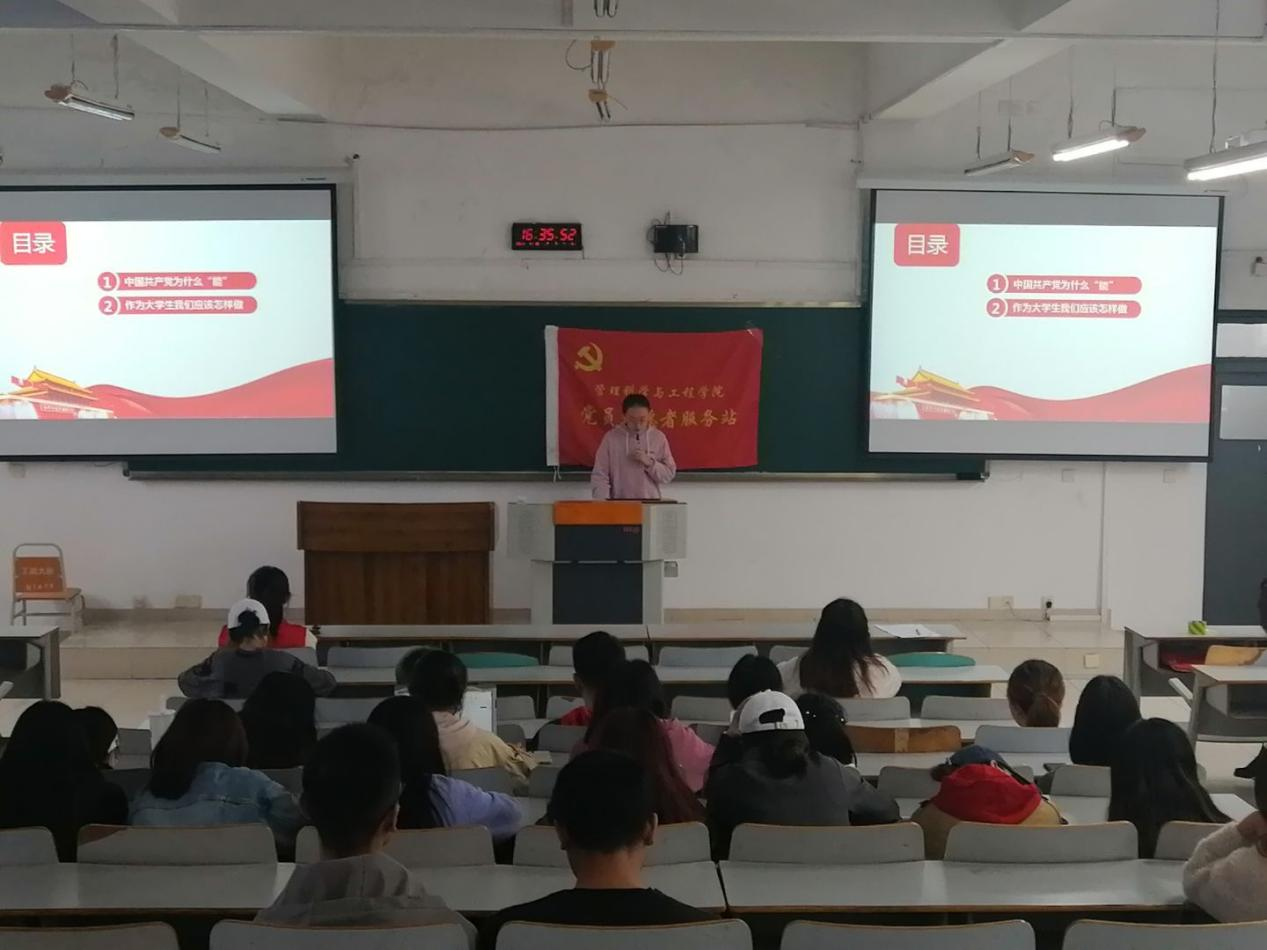 4月18日下午4:00在07408教室,“盛世华诞,党在我心——我与党合影”主题线下分享活动顺利举办,管工学院全体员工党员和入党积极分子积极踊跃参与了本次活动。活动首先进行了“听歌答题”环节,每位到会同学都积极参赛,了解每支党歌背后的厚重情怀。随后,多位同学作为主讲人为大家带来线下“我与党合影”照片分享。其中,作为预备党员的18信管一班刘银银同学从学习、工作、生活、活动四个方面为大家介绍了党史、入党流程、党组织生活及京剧《张露萍》观后感等各方面内容。京剧《张露萍》的观后感更是令同学们印象深刻,在花一样的年纪里,张露萍同志用其短短的一生演绎了对党的坚贞不渝,面对党和小我,她毅然背井离乡投奔于党的建设事业。作为新时期的党员,我们所生活的时代和革命建设初期相比无疑是更和平、更幸福的,但我们不能忘记革命先辈付出的鲜血,我们要在党的带领下,坚守初心,专心践行党的宗旨,努力建设好党的美好蓝图。作为入党积极分子的19电商二班冉昕瑜同学则着重为大家介绍了重庆工商的小红帽党建基地,该基地以社区小红帽为载体,在志愿服务中践行党全心全意为人民服务的宗旨,坚持“一件事做了三十年、三十年做了一件事”,培养员工党员、入党积极分子培养勇于担当、服务社会、甘于奉献的精神。小红帽党建基地是HAHA体育党建工作的一张名片。研究生代表杨金汇同学在与大家分享了京剧《张露萍》的同时,也提出了我们加入中国共产党的初心,初心是什么?初心是本心、本源;初心是信仰、理想;初心是信念、信心。中国共产党的初心就是为中国人民谋幸福,为中华民族谋复兴。依靠中国人民创造历史伟业,带领中国人民创造美好生活。中国共产党最大的初心就是“以人民为中心!”
