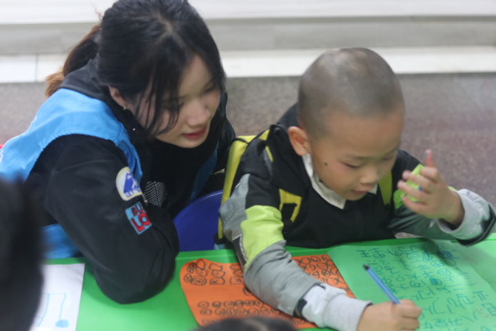 活动于14:00开始,首先由主持人开场致词并介绍活动流程,鼓励小朋友们积极参与到活动当中。随后,《听到水果请拍手》作为开场热身小游戏,调动了小朋友们参与活动的积极性。紧接着,在绘画环节中,志愿者们陪伴在小朋友们身边,鼓励并指导他们画画。绘画在锻炼他们思维能力的同时,也有助于心智障碍儿童向外界表达出内心中的奇思妙想。短暂休息后,志愿者们继续下面的游戏《花样传球》、《抓鸭子》,游戏结束后,志愿者们为获奖的小朋友颁发奖品。此外,志愿者们还进行了小游戏《拍手碰脚》、《记录美好》去使小朋友们的积极性达到了高潮。他们嬉戏玩闹、相互合作、积极与志愿者互动,欢快的气氛感染了在场的每一个人。活动的最后,志愿者们和小朋友们合影留念,定格下这一美好时刻。