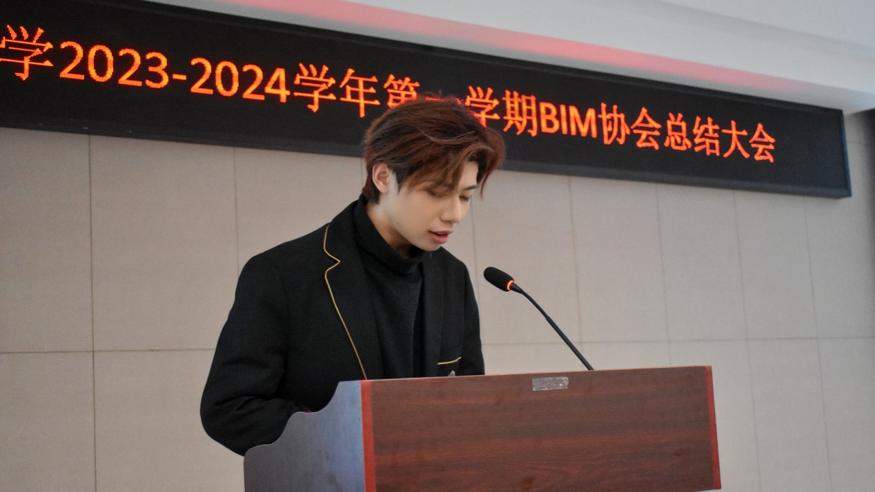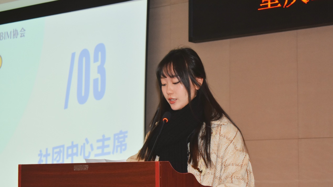 接着由社团中心主席团成员陈映溪同学发言。她首先对BIM协会所取得的各项成就表示赞许,接着她讲到,在刘涛会长的带领下,BIM协会同各社团联系不断加深,协会面貌也在不断丰富,“三下乡”活动成功入围展示、发展型资助项目立项等成绩都体现着协会的深厚底蕴。员工社团是人才培养的重要阵地,BIM协会便是提升自我的一片沃土,祝愿BIM协会在各位成员的共同努力下能够越办越好。