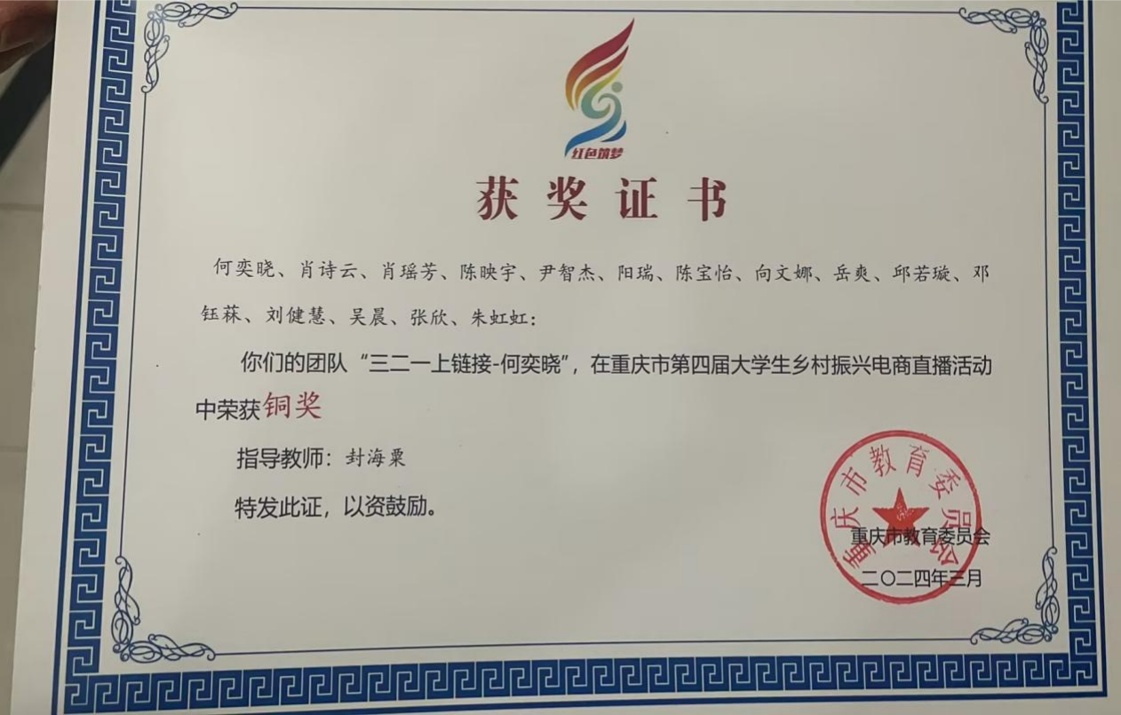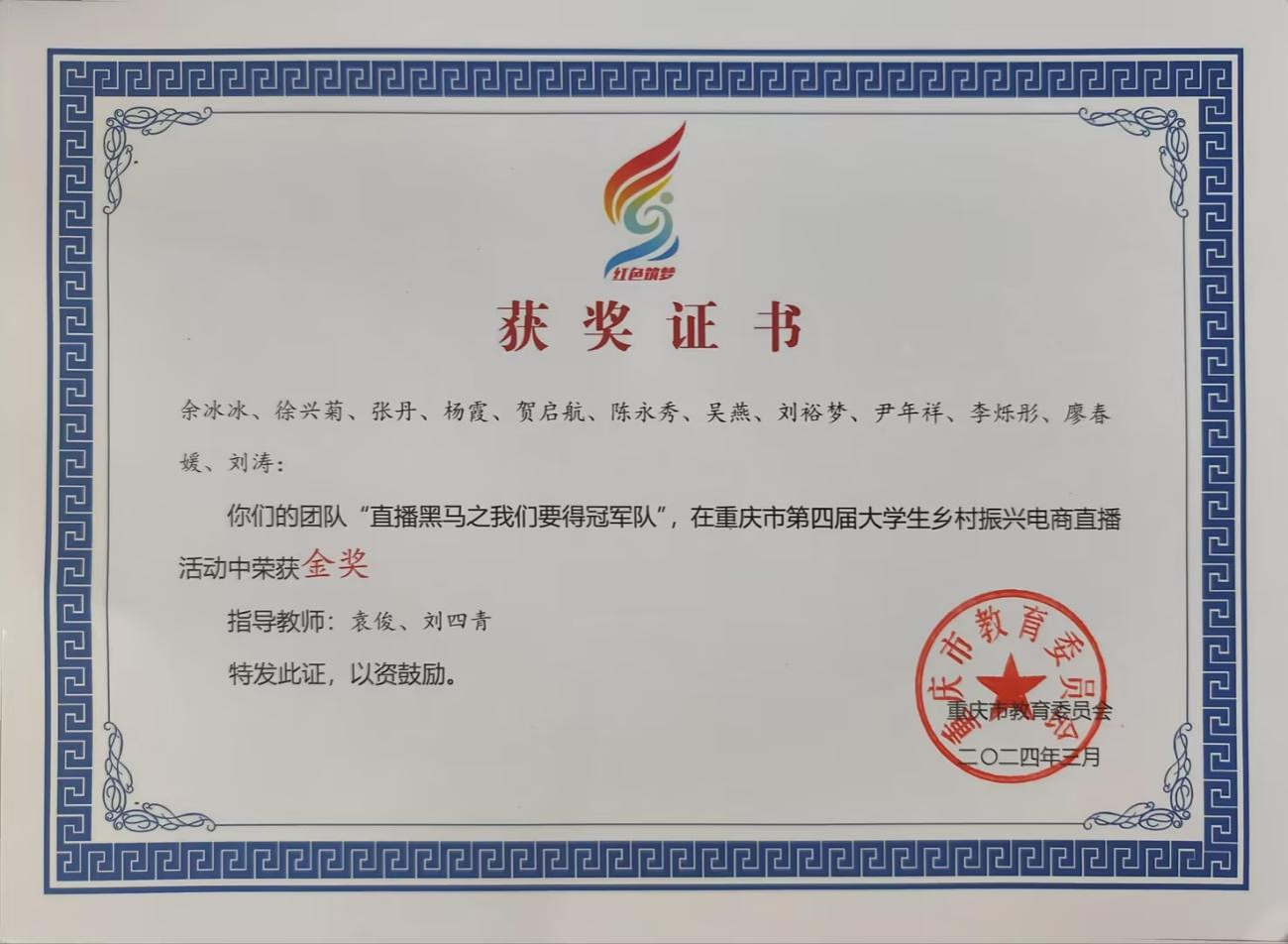 据重庆市教委发布重庆市第四届老员工乡村振兴电商直播活动评选结果通报(渝教高函〔2024〕11号),我院学生在该项比赛中获得金奖1项、铜奖1项,袁俊、刘四青老师荣获“优秀指导教师”称号。