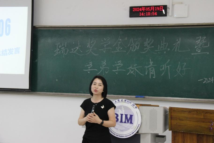 接下来,肖艳教授对瑞达公司慷慨资助工程学子奖学金致以谢意。祝贺了获奖的同学后,肖艳教授希望低年级的同学能够在本次活动中明确自己的目的,争做有担当、有理想、有抱负的新时代青年。