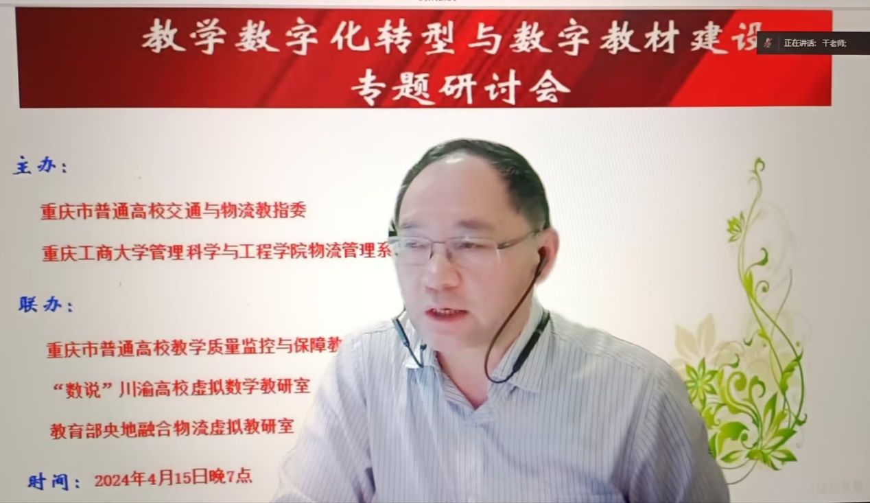 2024年4月15日晚七点,为了适应教育信息化发展的需要,提高教育资源利用效率,满足员工的学习需求,促进教师教学能力的提升,推动教育行业的创新发展。重庆市普通高校交通与物流教指委和哈哈体育物流管理系开展了教学数字化转型与数字教材建设专题研讨会,物流系主任龚英教授主持此次会议。