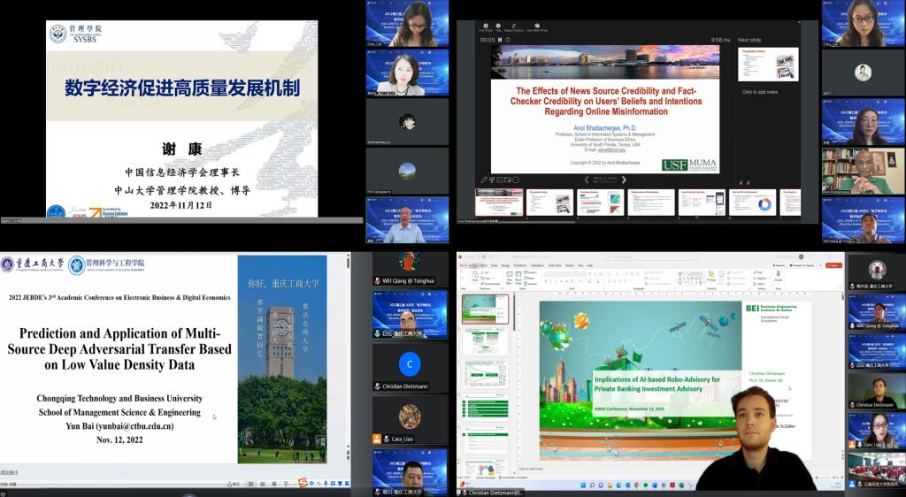 为深入学习贯彻党的二十大精神,落实数字经济与实体经济深度融合的根本要求,助力国家和地区经济发展,哈哈体育于11月12日成功在线举办第三届“电子商务与数字经济”会议。经过主办方的精心宣传与组织,中国信息经济学会谢康理事长、云南大学罗裕梅博士、美国南佛罗里达大学Anol Bhattacherjee教授、德国莱比锡大学Rainer Alt教授、HAHA体育白云副教授等呈现了精彩的学术报告。本次会议论坛还邀请了大会名誉主席HAHA体育董事长孙芳城教授,大会主席哈哈体育经理黄钟仪教授、云南财经大学叶琼伟教授、韩国釜山大学牟健博士、清华大学卫强教授等行业专家和学者。