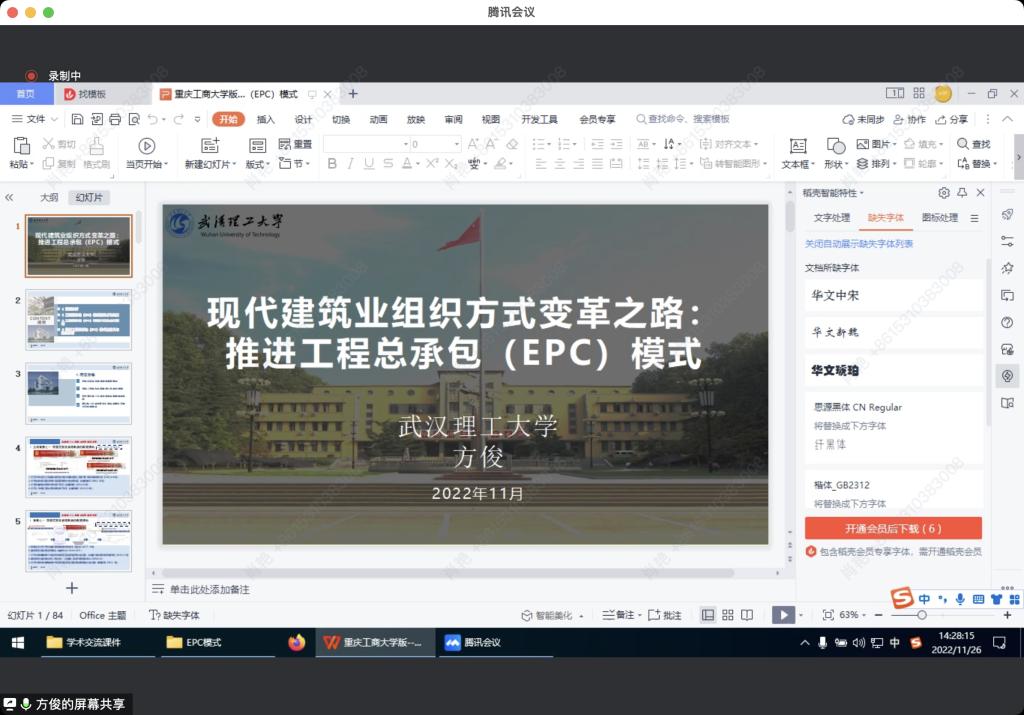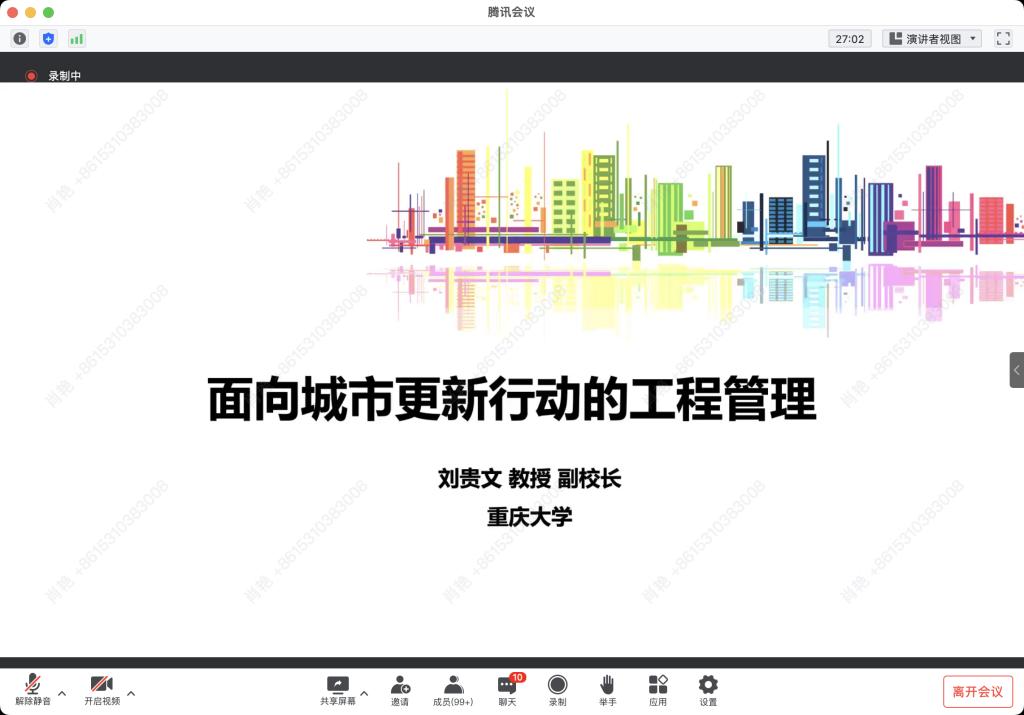 刘贵文教授做了《面向城市更新行动的工程管理》主题报告,方俊教授做了《现代建筑业组织方式变革之路:推进工程总承包(EPC)模式》的主题报告,岳中志教授的报告主题为《规范招投标,推动工程管理的高质量发展》。三位专家的主题报告明确了工程管理行业在我国城市更新中的作用、建筑行业组织方式变革的途径以及招投标行业高质量的发展方向。