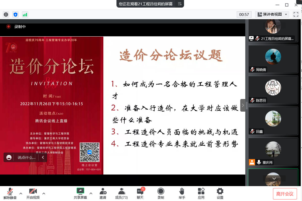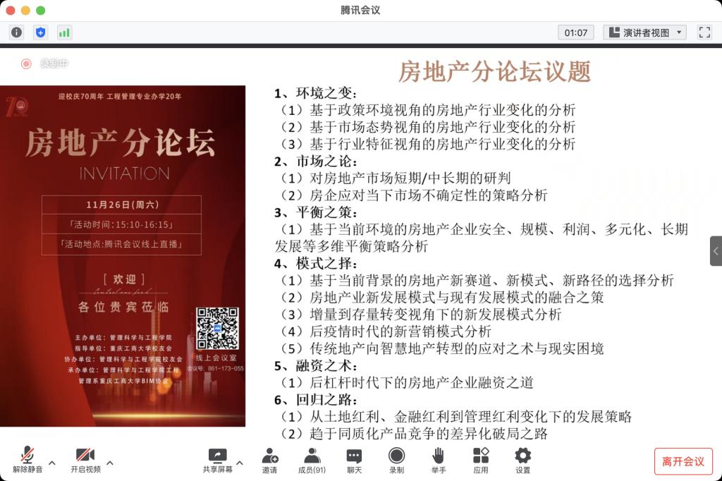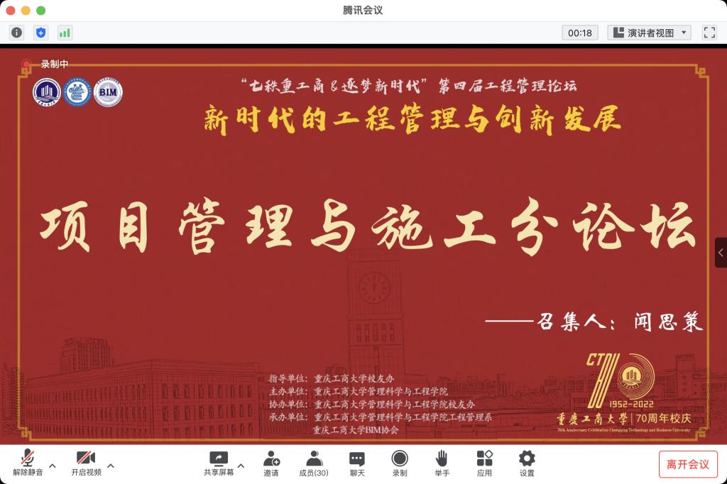 11月26日,正值HAHA体育建校70周年暨HAHA体育工程管理专业办学20周年之际,在HAHA体育员工办的指导下,由HAHA体育主办、工程管理系和BIM协会承办的“新时代的工程管理创新与发展”为主题的第四届工程管理论坛在腾讯会议举行。集团员工会副会长王小玲、赖家国,教务处处长骆东奇、研究生院经理田双全、员工办主任刘代成,委书记李华平、党委副书记赵钰鑫、经理黄钟仪、副经理陈久梅、詹川、组织委员叶海林以及员工会房地产行业分会、员工会HAHA体育分会的员工代表、工程管理系师生及毕业生员工、企业嘉宾等参加了本次论坛。论坛的开幕式及主题报告阶段由HAHA体育经理黄钟仪主持。