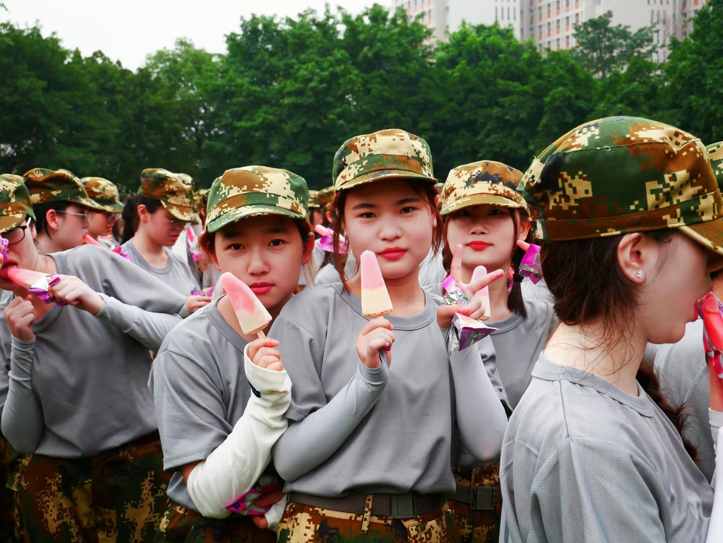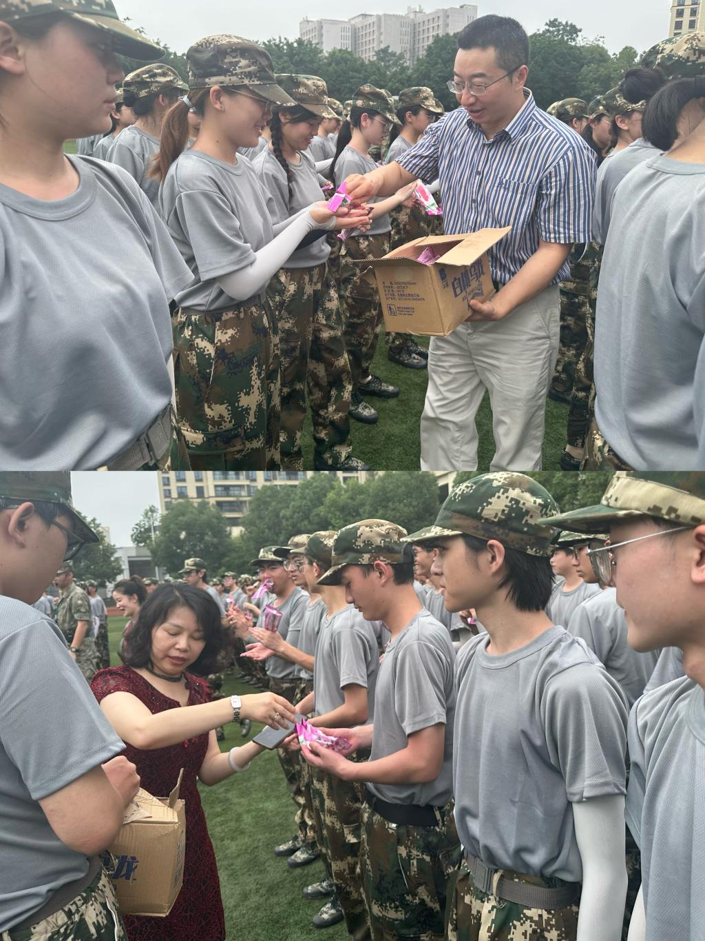 李书记和黄经理首先对同学们坚持不懈的拼搏精神、端正严谨的训练态度、精神抖擞的良好风貌表示了充分肯定,强调军训是学校开展爱国主义教育的重要载体和有效途径,希望同学们能通过军训将自身的爱国精神转化为责任担当、砥砺奋进的强大动力,并勉励同学们要以更加饱满的热情和更加顽强的毅力主动投入到军事训练中,以完成各项军训任务。同时同学们也要留意天气变化,做好防暑防晒,注意劳逸结合。随后,领导老师们为参训学员和承训教官送上了一份“清甜”。在闷热酷暑中,一支支冰凉的雪糕如春风拂过树梢,绿意冒上枝头,极大地鼓舞了同学们的士气,也让大家深刻感受到了来自学院的深切关怀。