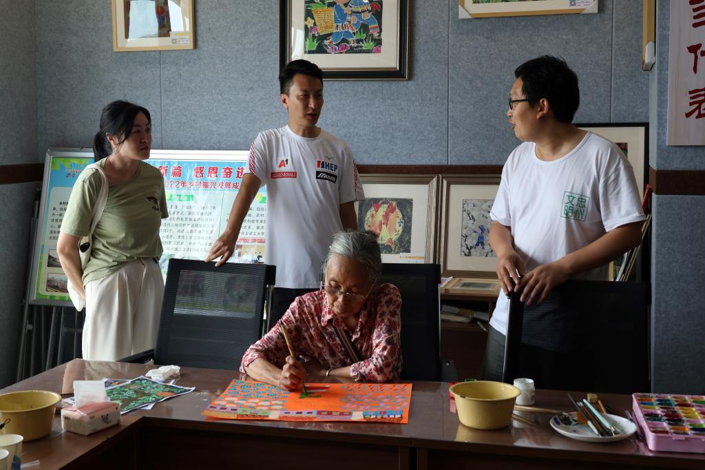 7月12日,哈哈体育小云雀服务队在重庆市忠县磨子乡石梯村驻村书记陈琛的带领下,走访调研磨子乡土家画农民画室。