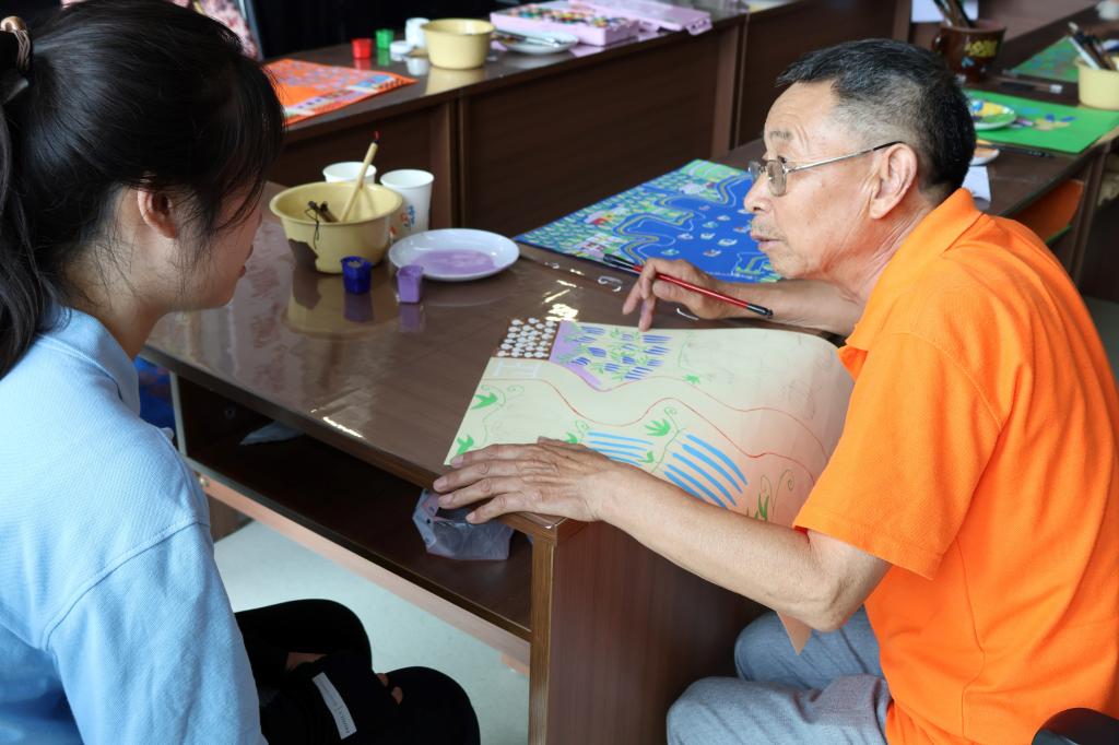 “这是种的辣椒,这是茶叶......”画室里的老人向服务队成员热情介绍自己的作品。画室里的画家们都是当地的村民,他们每个人的脸上都洋溢着幸福的笑容。“这是结婚抬轿,我想通过这个来表现乡亲们生活的幸福,这是小孩在打闹......”“自从乡里推广山水画之后,我就天天来这里画画,这比天天打麻将有意思多了!”画室的村民们说着。