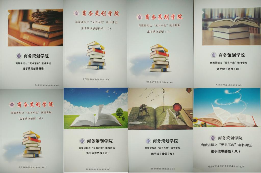 商务策划学院“无书不欢”读书讲坛的推荐书目更是经过了精心挑选的,每一本都是学科领域的资深导师、优秀学子或学院领导推荐的,涵盖了古今中外很多经典名著,有《资本论》《家庭、私有制、国家的起源》等马克思主义经典名著,有《易经》《道德经》《论语》等中国优秀思想文化传统经典名著,有《毛泽东传》《周恩来传》《邓小平时代》《居里夫人传》等古今中外名人传记,有《平凡的世界》《苦难辉煌》《巴黎圣母院》《小王子》等中外文学名著,有心《新供给主义经济学》《牛奶可乐经济学》《深度营销》《卓有成效的管理者》等经济和管理类名著,有《物种起源》《大数据》等科学类名著等等,这些书籍涵盖范围广且紧紧结合当代发展潮流,对人生具有指导意义。