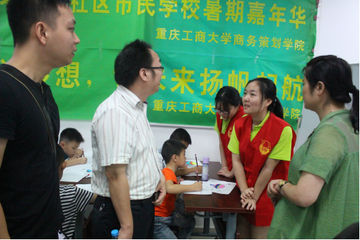 一走进教室,14物流四班团支书易明欢同学正向孩子们讲授绘画课,氛围非常热烈。叶海林副书记不时向老顶坡社区党委范书记、社区文化专干郑老师,及院分团委员工会干部了解员工的授课、住宿、伙食等情况。