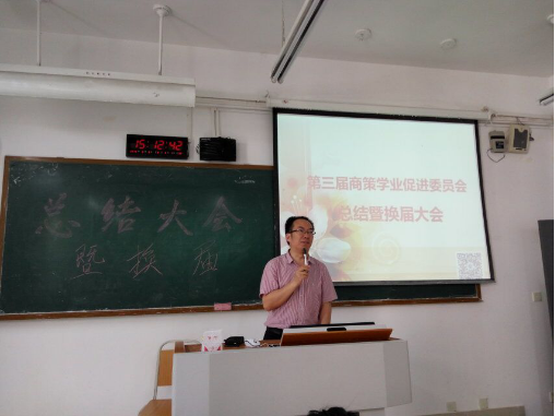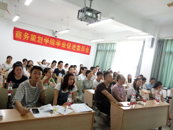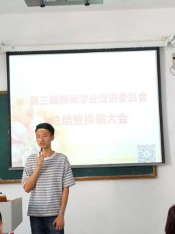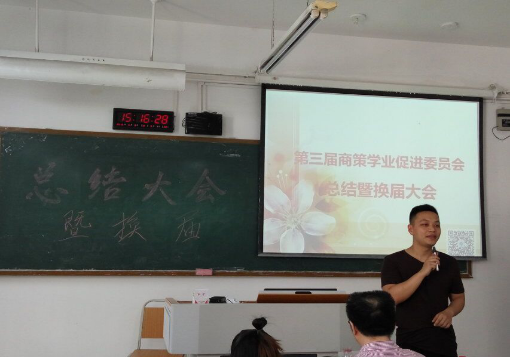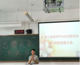 2016年6月5日下午两点整,商务策划学院学业促进委员会2015-2016学年度总结暨部长换届选举大会在博智楼07209教室举行。商务策划公司党总支副书记叶海林及辅导员、学进会指导老师邓艺,学进会全体干部干事参加了本次大会。