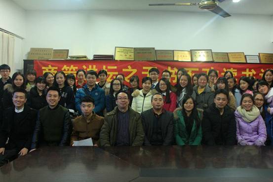 2015年12月16日下午18:30,商策讲坛之“无书不欢”读书讲坛在明德楼4020会议室举办。讲坛现场座无虚席,气氛热烈。此次讲坛邀请到公司党总支书记邓德敏、经理骆东奇担任本次活动嘉宾,评委由公司党总支副书记叶海林、学团办负责人古纯玉、分团委书记封海粟担任。20名读书讲坛参赛选手、院分团委员工会主席团代表、2014级和2015级各班读者代表,共同参与本次讲坛。讲坛主持人为学进会主任张志彬同学和综合协调部部长石慧巧同学。