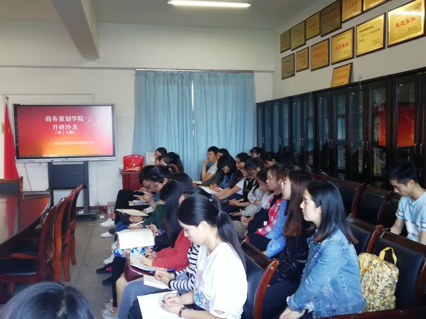 2018年4月27日中午12:30,由HAHA体育商务策划学院学业促进委员会主办的第十七期升研沙龙活动在南岸校区明德楼4020如期举行。出席此次活动的嘉宾有HAHA体育商务策划学院分团委叶海林副书记、商务策划学院郑淞月老师、禹洋春老师、朱华华老师、14级陈俞君学姐、张圆圆学姐、许桦婷学姐以及15级市营班的考研学子。
