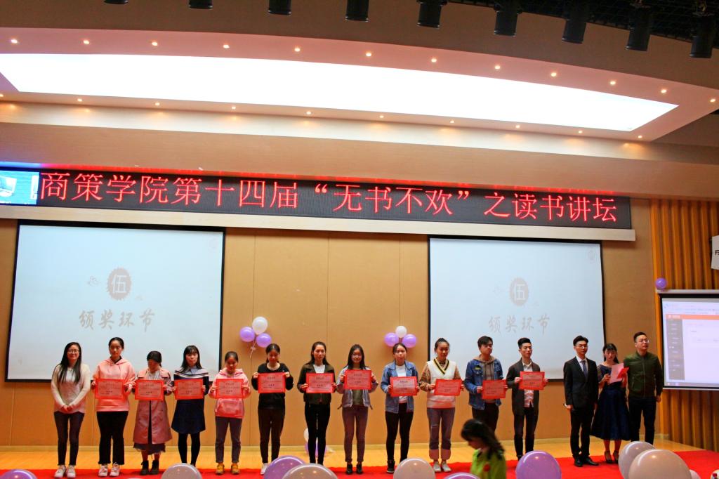 接着进入颁奖环节。被评选为读书优秀班级的有:17级物流管理四班、17级国际商务二班、17级物流管理一班、16级物流管理三班、17级物流管理二班、17级电子商务一班;优胜者:覃冬梅、王书月、周俊芳、袁梦、郭婷婷、李思琪、刘智莲、熊毓康、陈含、汤乐乐、黄菲。经过现场评委讨论决定,周琳、胡晓玉、余宗昆、刘竞豫、黄兴吉五位选手获此次比赛三等奖,李长基、廖仪慧、李莎莎三位选手获此次比赛二等奖,李佳佳、陶莹莹两位选手获此次比赛一等奖。学院在为本次优秀选手、班级准备丰厚奖励的同时也希望同学们能从中获益受启,以此为榜样,继续展翅拼搏。