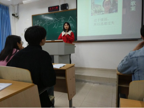 第三位分享者芦芮同学分享的书目是《撒哈拉的故事》:出生于重庆的三毛带给我们亲切感,每一粒沙形成的撒哈拉沙漠,为何她抛弃繁华的都市生活来到这片苍凉的土地?对自由的追求与向往,也将三毛与荷西的爱似甘霖洒在这片干涸的大地上为其带来无限的希冀。