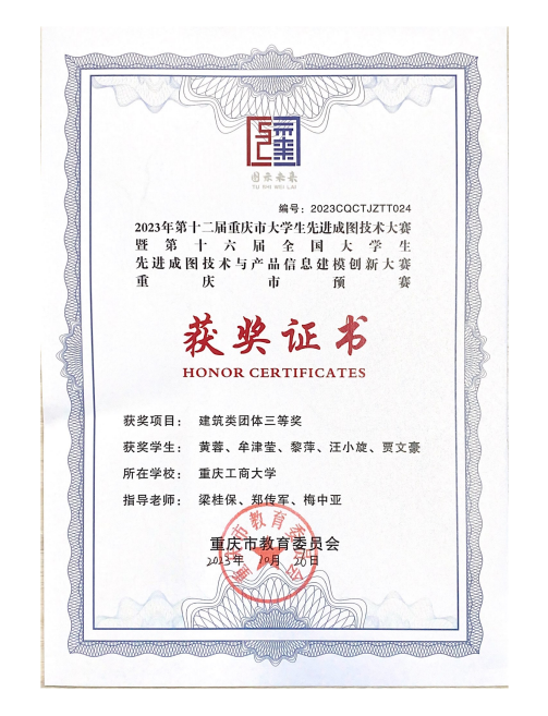 5月27日上午,在重庆市预赛中,公司选手在3个小时内围绕给定建筑图纸进行建筑施工图的识图、表达及绘制,展现了良好的竞赛风貌和图学能力。经过激烈的角逐,最终,由工程管理专业员工黄蓉、牟津莹、黎萍、汪小旋、贾文豪组成的竞赛团队荣获建筑类团体三等奖,三位指导老师分别荣获优秀指导教师三等奖(建筑类)。