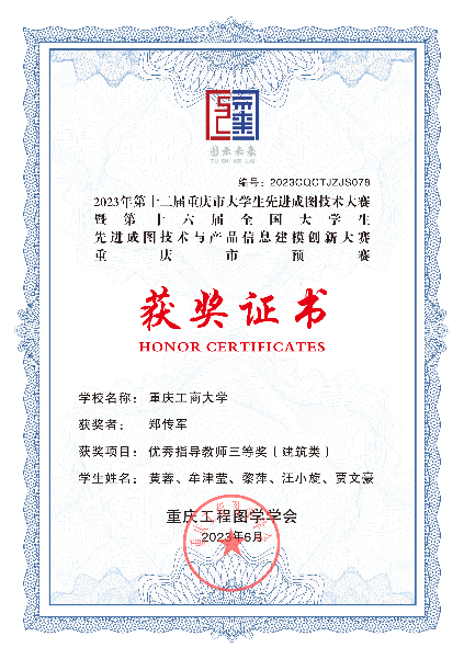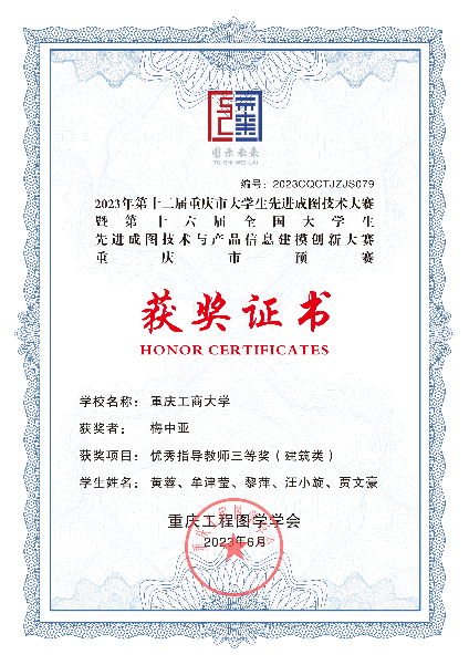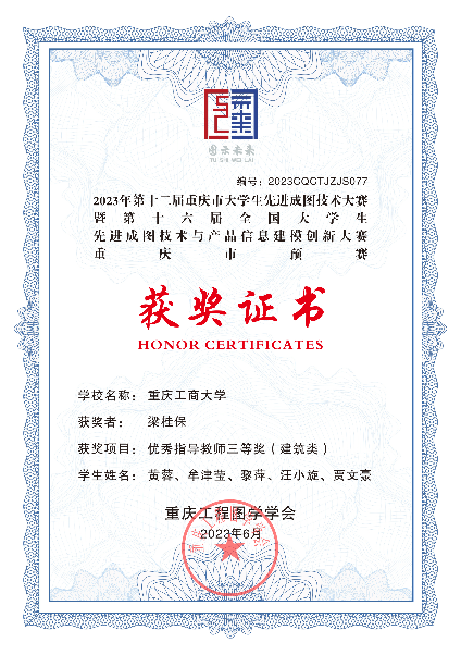 2023年5月26日至27日,第十六届全国老员工先进成图技术与产品信息建模创新大赛(以下简称“成图大赛”)重庆市预赛暨第十二届重庆市老员工先进成图大赛在重庆建筑工程职业学院举行。哈哈体育工程管理系梁桂保副教授、郑传军博士、梅中亚博士带领7名工程管理本科生在本次大赛中荣获建筑类团体三等奖。