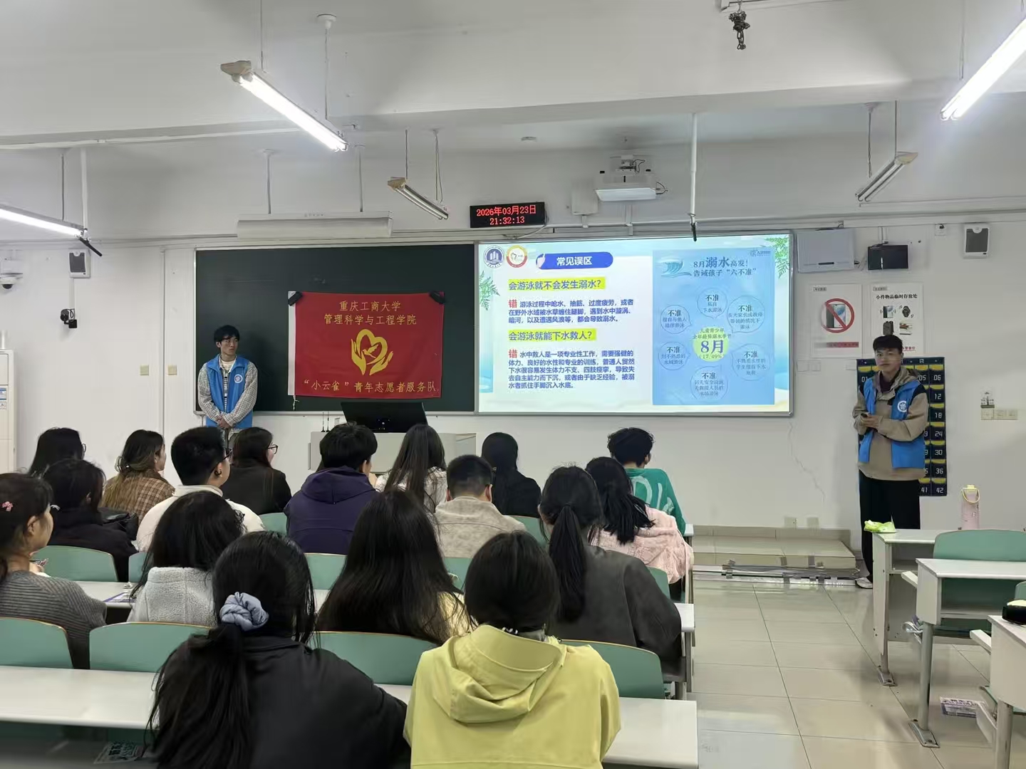 3月23日晚,志愿者们走进教室,以主题宣讲的形式为同学们带来了一堂生动的防溺水安全教育课。