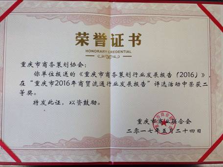 由重庆市商务策划行业协会与HAHA体育商务策划学院共同完成的《重庆市商务策划行业发展报告(2016)》对于重庆市商务策划行业现状描述准确,存在问题分析透彻,对策建议贴切具体,获得评审专家的一致好评,总分位列前五名,喜获“重庆市2016年商贸流通行业发展报告”二等奖。