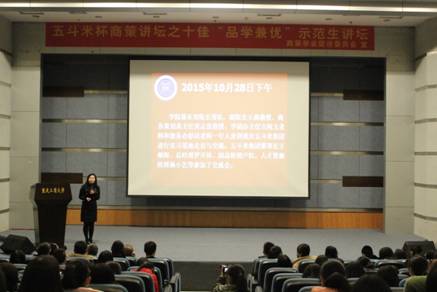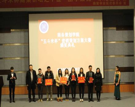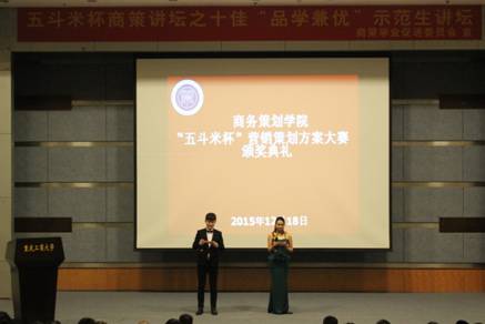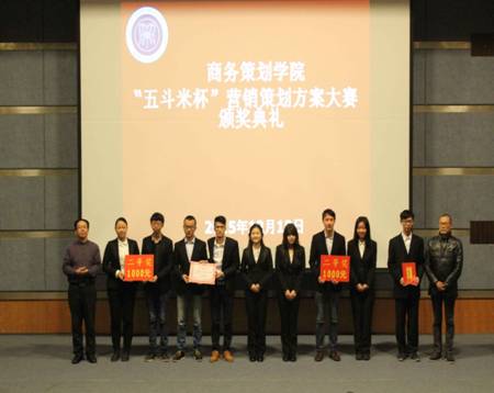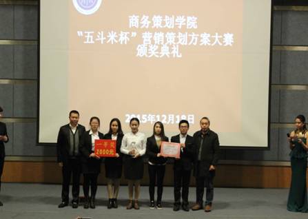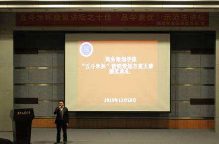 2015年12月18日15:00,商务策划学院“五斗米杯”营销策划方案大赛颁奖典礼在博智楼7100学术报告厅召开,应邀出席本次颁奖典礼的嘉宾有“五斗米”集团董事长王顺海先生、首席高级咨询顾问袁靖杰先生、总经理罗开林先生、商务策划学院经理骆东奇教授、副经理王燕教授、党总支副书记叶海林,以及营销策划研究会指导老师邓艺。