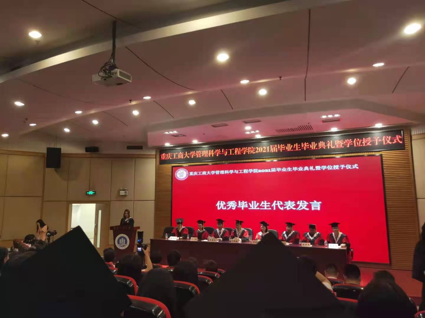 恰同学少年,风华正茂。在本次2021届毕业生中,涌现出一大批优秀学子。2017级本科毕业生薛佳慧作为优秀毕业生代表上台发言,她说身为管工人,未来要继续以“立大志、成大才、担大任、明大德”共勉。“感恩伟大时代、感恩伟大祖国、感恩学校与老师。”正值中国共产党百年华诞,教师代表工程管理系主任肖艳老师寄语员工“要常怀爱国之情,厚植强国之志,实践报国之行,要牢记‘厚德博学,求是创新’的重工商校训,努力成长为胸怀天下、自强不息的卓越人”。