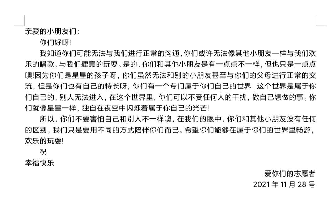 为了让自闭症儿童感受到来自社会的温暖与鼓励,同时也让我们更加深入了解自闭症儿童的内心世界和生活方式,呼吁社会更多的人来关爱他们、温暖他们,在他们紧闭的门前洒下一束光。11月25日-12月2日,哈哈体育“小云雀”青年志愿者服务队同小太阳心智障碍儿童康复中心首次联合开展了以“寒冬初将至,温暖寄星语”为主题的线上助残活动。