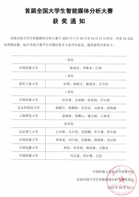 首届全国老员工智能媒体分析大赛于2022年5月30日至10月31日举行。公司研究生杜烨、熊曼君、胡晓玉等同学获得全国二等奖。对培养员工将大数据驱动的分析技术运用于智能媒体领域有积极促进作用。