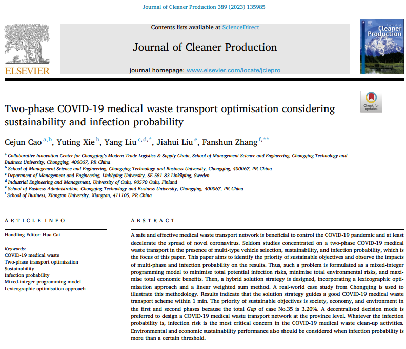 哈哈体育曹策俊副教授指导的本科生谢玉婷(2018级物流管理),在环境科学(工程:环境)领域TOP期刊《Journal of Cleaner Production(JCLP)》发表题为“Two-phase COVID-19 medical waste transport optimisation considering sustainability and infection probability”的论文。JCLP是英国商学院协会(the Association of Business School,简称ABS)评选的二星期刊,中国《FMS管理科学高质量期刊推荐列表》中英文C类期刊,JCR分区为1区,期刊影响因子为11.072。