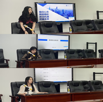 胡雪岩老师介绍了本次活动的目的及意义,并邀请李书记致辞。李书记简要介绍了当前就业形势,希望同学们在这次会议中向师兄师姐借鉴经验,少走弯路。致辞后,分享会正式开始。4位受邀的23届毕业生依次分享了自己的就业经验。首先,已签约浙江邦盛科技股份有限公司的杨爽艺同学,主要针对技术岗分享了求职经验,她推荐大家用SATR法则撰写简历,建议在上午10点和下午3点投递简历,提高简历的接收率。随后,成功上岸重庆大学博士研究生的张凤婷同学从博士的招生流程、申请经验、规划建议三个方面讲述自己的申博经历,并提出尽早确定目标院校,努力发表高质量论文,提升英语成绩。就职于重庆人文科技学院的蒋雯同学,介绍了高校入职的三个途径:行政岗、辅导员和专任教师岗,重点分享了教师岗位的招聘流程,提醒同学在试讲过程中知识点不能出错,尽量与员工互动,打造“沉浸式”课堂氛围。最后,已签约招商银行股份有限公司重庆分行的方瑾瑜同学通过线上会议分享了求职经验,从前期准备、备考内容、笔试、面试四个方面进行讲述,她强调实习的重要性,鼓励大家要提早进行实习。