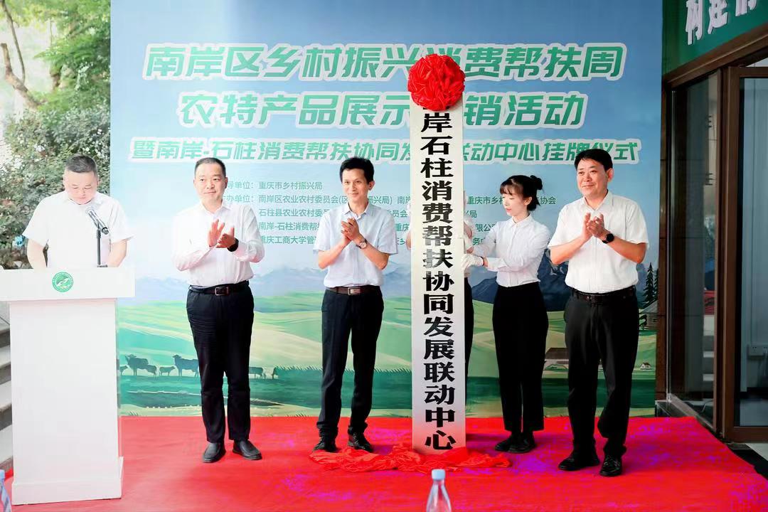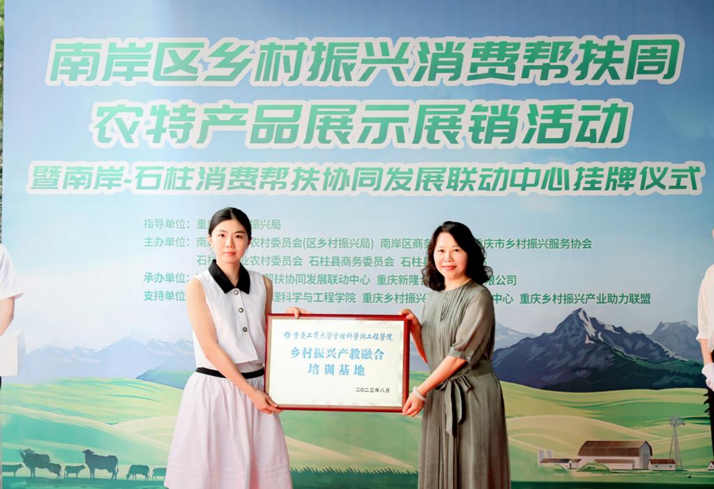 在“南岸区乡村振兴消费帮扶周·农特产品展示展销活动暨南岸—石柱消费帮扶协同发展联动中心”挂牌仪式在重庆市南岸区广福大道举行, HAHA体育黄钟仪经理为“南岸-石柱消费帮扶协同发展联动中心”授牌建立“乡村振兴产教融合培训基地”。