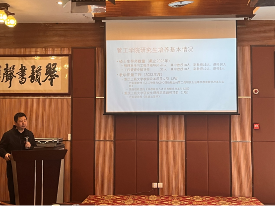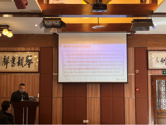 随后,重庆大学徐飞波主任从顺势、善为以及新形势下MEM的办学思考三个方面,对重庆大学MEM教育进行了全面深入的探讨,分享了重庆大学在MEM教育方面的思考与探索。徐主任首先从顺势的角度,介绍了全国MEM招生情况以及国家政策导向。他指出随着国家对高层次应用型人才需求的不断增长,MEM专业的招生规模也在不断扩大,该专业是有发展前景的。接着,徐主任从善为的角度探讨了重庆大学MEM办学的特色和经验,比较了重庆大学与其他高校的体制机制,详细介绍了三链协同产教融合教学培养模式等。最后,他还就新形势下MEM办学思考进行了深入探讨,指出当前MEM办学存在六大矛盾,需要深入思考和解决。此外,徐主任从四个方面介绍了其他高校的办学经验:认准定位、优化结构;课程及课程体系建设;企业定制班;管理团队。他表示,面对当前的办学矛盾,我们可以借鉴其他高校的办学经验,同时结合本土情况进行创新,以帮助我们更好地完善办学模式和人才培养方式。