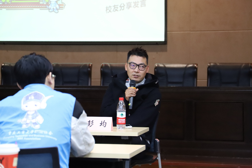 在分享环节,首先由彭均学长为大家分享经验,他首先向大家讲述了他的工作经历和物流行业的相关情况,并对物流行业的发展前景进行了展望,针对同学们所提的问题进行更深入的讲解,让同学们更加直观地了解物流行业发展现状,为同学们未来的发展方向提供了新思路。