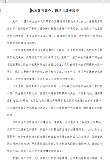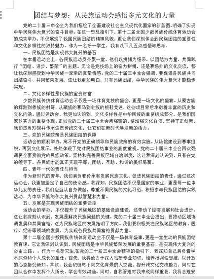 在作品征集阶段,学子们紧扣民族大团结主题,从运动会开幕式的文化盛宴到赛事中的拼搏协作,深入挖掘素材,以真挚笔触抒发感悟。他们以体育为纽带,阐述民族团结于民族复兴征程的关键意义,展现新时代青年对国家发展的深度思索。行政部严谨审核,确保作品原创性与契合度,为活动品质把关。