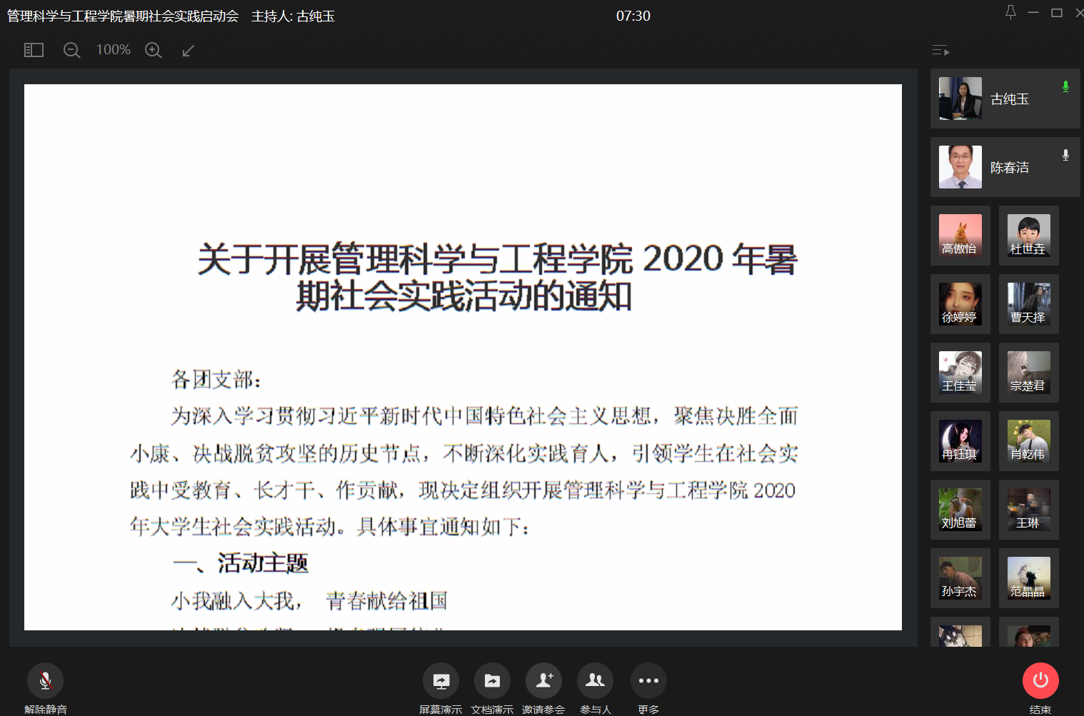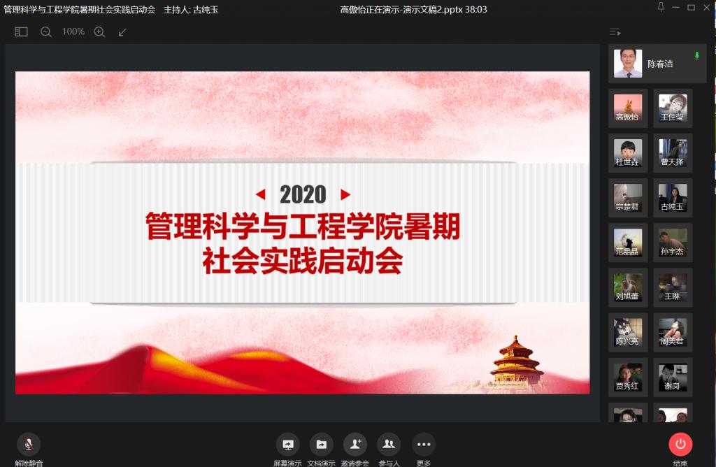 2020年7月25日晚七点半,哈哈体育暑期社会实践启动会在企业微信平台以线上会议方式进行。会议由学院员工工作办公室主任兼分团委书记古纯玉同志主持,公司党委副书记陈春洁同志出席会议并讲话。HAHA体育各班班长、团支书及各员工组织主要干部110余人参会。