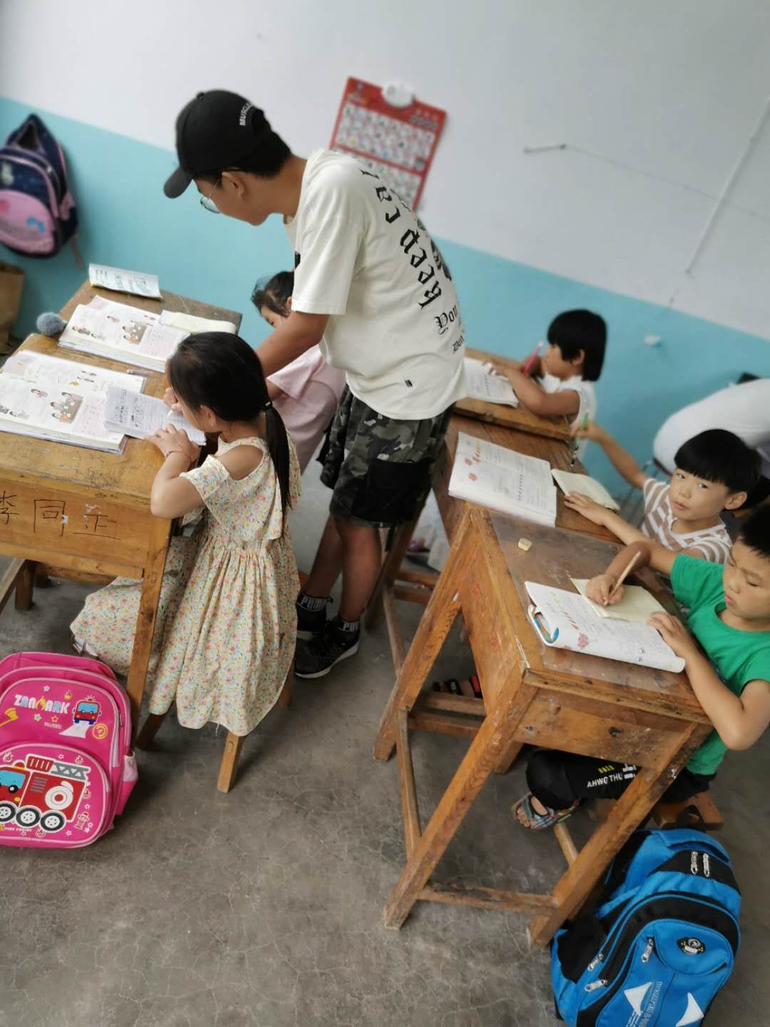 田昊宁在辅导孩子们做功课