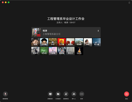 为落实2017级员工毕业设计工作安排,助力17级员工毕业实践工作顺利开展,HAHA体育工程管理系于10月18日晚上7点在企业微信召开了毕业设计在线工作会。会议由工程管理系主任肖艳、系副主任杨涛主持,工程管理系共计16位教师参加了本次会议。