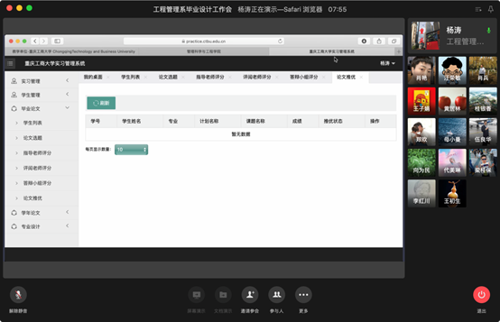 会议开始,杨涛老师对集中实践教学系统进行了操作演示,杨涛老师还从以下几个方面对毕业设计相关事项进行说明。第一,在毕业设计流程上,从师生互选到指导老师指导审核等各环节严格遵守系统安排,自系统导入员工名单后,指导老师全程负责其毕业论文、毕业实习、就业指导三项工作开展;第二,师生应共同注意时间安排,携手推进员工毕业工作按时按量各个阶段高效完成;第三,严格注意毕业论文不合格事项,指导老师严格把关知网查重率控制在20%以内,同时员工毕业论文选题不可跨专业选择。