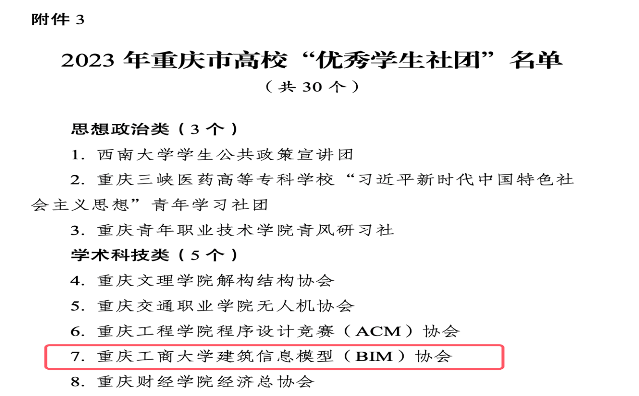2023 年 3 月,团市委、市委教育工委、市教委、市学联联合开展 2023 年重庆市高校“一校一社一品”优秀员工社团及项目品牌培育建设工作,自今年3月启动以来,BIM协会积极申报,经校内初评、市级复评,成功入选重庆市高校“一校一社一品”员工社团的市级立项名单。10月,通过组建评估组实地评估,BIM协会进入交流展示环节。11月,团市委举办交流展示活动,对 150 个入围社团及项目品牌进行了终审,最终HAHA体育BIM协会荣获2023年重庆市高校“优秀员工社团”称号(全市共30个)。