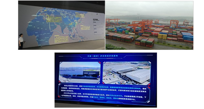 第一站,师生一行来到位于江北区鱼嘴的重庆果园港国际物流枢纽建设发展有限公司。在果园港展厅,负责人蒋老师介绍了果园港的发展历史、发展规划、运营现状、发展趋势等内容。重庆果园港国家物流枢纽是经国家发改委、交通部批准设立,是我国内河最大的铁公水多式联运枢纽港,其定位为内陆型开放口岸、国际多式联运综合枢纽、大宗商品交易中心、中新(重庆)战略性互联互通物流示范区、内陆自由贸易港核心区,陆海新通道、中欧班列(重庆)和长江黄金水道在这里汇聚,是国家建设“一带一路”、“长江经济带”的重要节点。此次调研学习活动满足了同学们对于港口物流运营、港口物流搬运设施设备的好奇心,解答了同学们理论学习中的一些疑惑,加深了同学们对专业知识的理解。